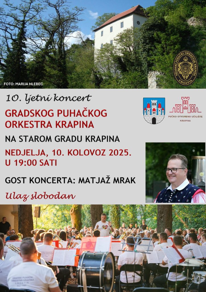 Ove nedjelje, 10. kolovoza u 19 sati u predivnom ambijentu kod Starog grada u Krapini održava se 10. ljetni koncert Gradskog puhačkog orkestra Krapina! Rezervirajte svoje vrijeme i ne propustite ovu glazbenu poslasticu! Gost koncerta je poznati slovenski glazbenik Matjaž Mrak.